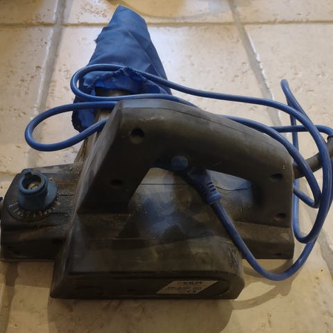 Dette er en elektrisk høvl fra Alpha Tools, model BEH 600. Den har et ergonomisk håndtag og er udstyret med en elektrisk ledning til strømforsyning. Toppen har drejeknapper til justering. Bunden viser klare tegn på brug med slidmærker på den metalflade, der kommer i kontakt med materialet. Størrelsen er angivet som 28x15 cm.