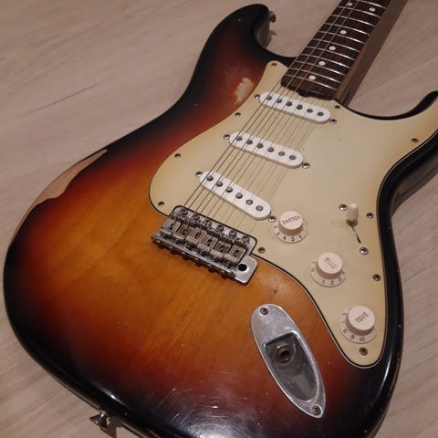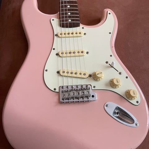 Guitaren har en rigtig flot Fender Stratocaster krop i lyseblå perlemor lignende farve….nærmest uden en eneste rids. Kroppen er fra 01’ altså 25 år gammel og den står virkelig flot.