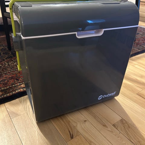 Dette er en kompakt camping køleboks med håndtag, der gør det nemt at transportere. Den har en grå farve med et hvidt håndtag og kant. Boksen er designet til at holde mad og drikkevarer kolde, hvilket gør den ideel til udendørs aktiviteter som camping og picnic. Den har ventilationshuller på toppen og en kontrolpanel med muligheder for at køle og tænde/slukke. Dimensionerne er 43x33 cm.