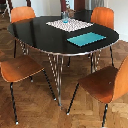 Den grafiske komposition viser det ikoniske Piet Hein 'Superellipse' spisebord sammen med Arne Jacobsen 'Syver' spisestole.