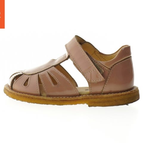 Et par lyserøde sandaler til børn i størrelse 21. Sandalerne har remme og en blomsterdetalje på den øverste del af skoen. Sålen er i brun farver. Velcro-lukninger sikrer en nem på- og afklædning af skoene.