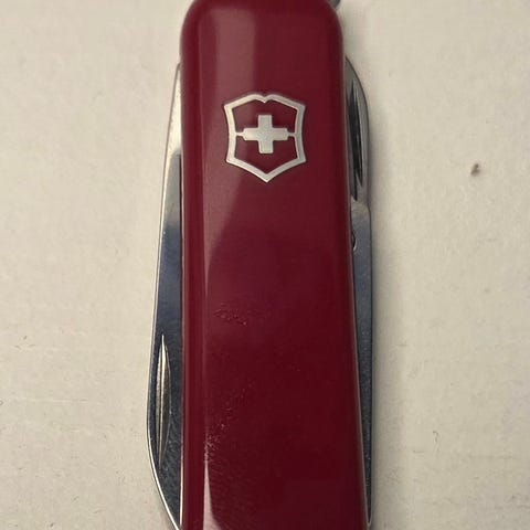 En schweizerkniv fra Victorinox med mørkegrøn plastikgreb. Kniven har flere funktioner såsom knivblad, skruetrækker og saks. Der er en lille ring i enden til fastgørelse til nøglering. Pakken, som kniven kommer i, bærer også Victorinox logoet. Denne model har 'BALL' mærket på knivens greb.