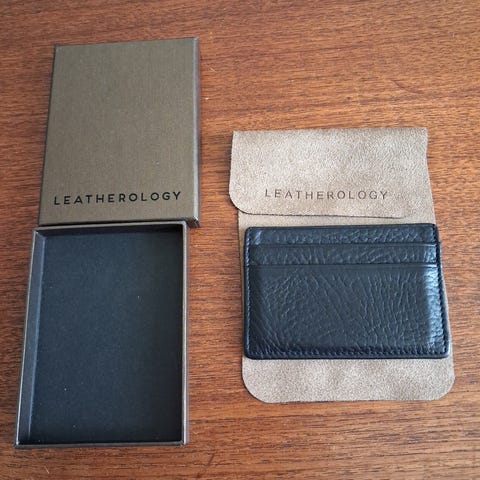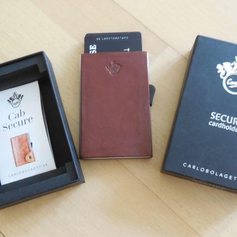 Denne kortholder er lavet af læder og har en elegant, simpel design. Den har dimensionsmål på 9,5x6,5 cm og en lysebrun farve. Kortholderen en trykknappe mekanisme og en lille logo på forsiden, der tilhører Carlo Bolaget. Bagsiden viser en stregkode med serienummeret 61-326. Den er designet til at holde kreditkort sikkert.