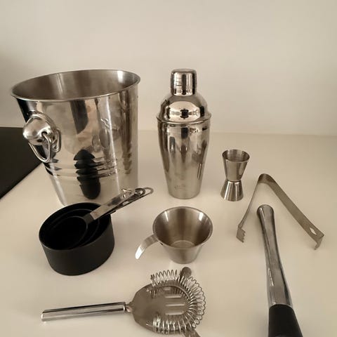 Dette barværktøjsæt indeholder tre dele: en flaskeåbner, en isske og en skærer, som alle er lavet af metal. De har hver en længde på henholdsvis 16 og 18 cm. De kommer pakket i en original kasse, og værktøjerne har et skinnende finish, hvilket giver dem et klassisk og professionelt udseende. Sættet er ideelt til at udstyre en bar med praktiske værktøjer til at lave drinks med stil.