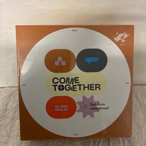 Come Together Det store selskabsspil er et brætspil designet til sociale sammenkomster. Spillet indeholder en spilleplade med forskellige felter og en drejeskive, der bruges til at styre spillets gang. Det er velegnet til grupper og fokuserer på interaktion mellem spillere.