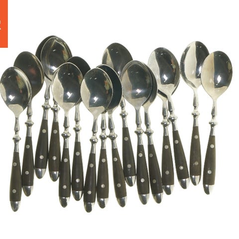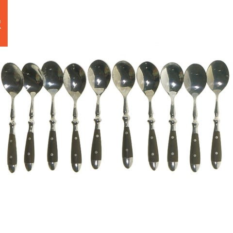 Sættet består af 6 skeer med træhåndtag og skafter af rustfrit stål. Skeerne er 15 cm lange og har en klassisk, rustik stil med messing metalindsatser på håndtagene. Ideel til servering af dessert eller te.