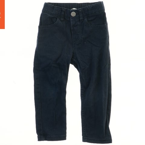 Blå babybukser med elastisk taljebånd og en lomme foran. Bukserne har også elastiske manchetter ved anklerne.