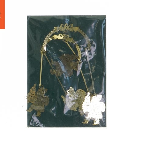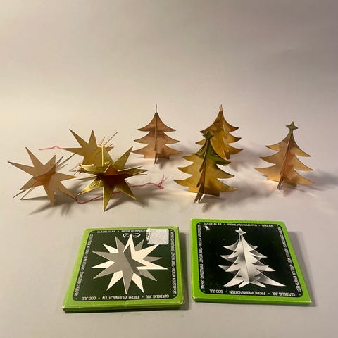 Disse to ornamenter har et stjerneformet design og er lavet af guldmetal. Deres størrelse er 7 cm, og de er beregnet til dekoration, muligvis som en del af en juleudsmykning. Ornamenterne kommer i en gennemsigtig plastkasse med et designmærke indikator.