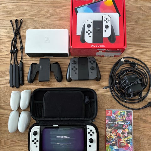Nintendo Switch OLED konsol i hvid med skærm, Joy-Con controllere, dock, oplader og kabler. Konsollen Det virker som det skal de to små sorte der ligger i posen de har aldrig været brugt og controlleren er heller ikke blevet brugt