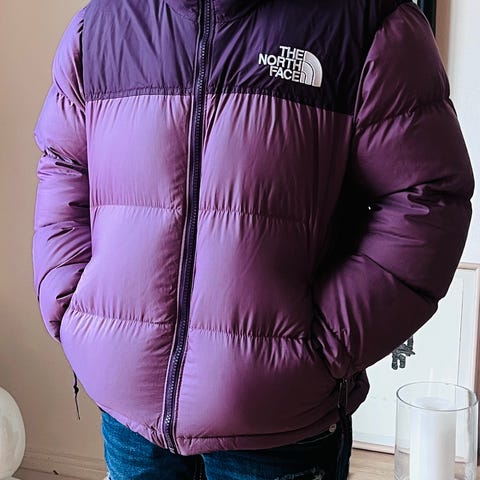 The North Face Andet udendørstøj dunjakke i størrelse M til kvinder. Jakken er grå og fyldt med dun, hvilket giver isolering og varme. Den har en hætte med pelskant og lynlåslommer. Jakken er designet til udendørs brug og passer til forskellige vejrforhold.