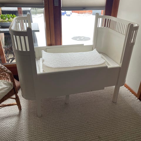 Klassisk Juno baby/junior seng (lilleper seng) til børn i hvid farve. Der medfølger sider og en ny madras.