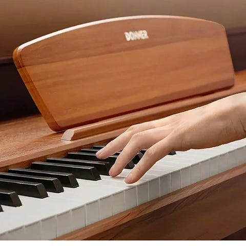 Pænt og velholdt instrument, med en fin og blød klang, der er nodestativ, bænk og andet tilbehør.
