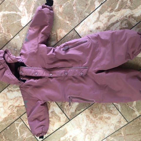 I en sart rosa/lilla farve. Ingen slid eller huller - så god som ny. Aftagelige vanter og futter.