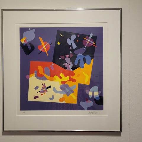Axel Nielsen litografi med abstrakt motiv i varme farver som orange, gul og lilla. Signeret af kunstneren Axel Nielsen. Litografiet er indrammet og velegnet til ophængning som dekorativ kunst - der er dog ikke glas i, så det skal der evt. sættes i igen.