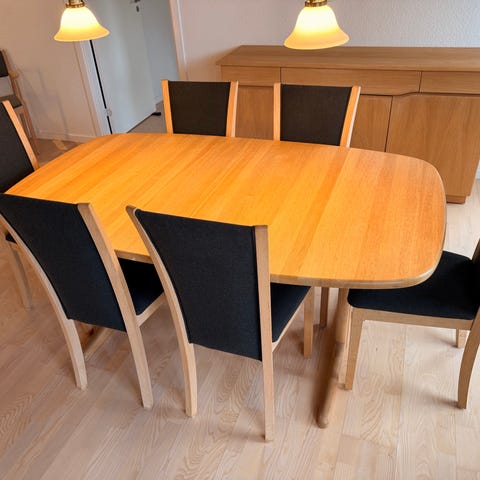 Der kan medfølge 6 stole oven i handlen (dem på billedet) hvis man er interesseret. 2 af stolene trænger til at blive ordnet under bundet af sædet.