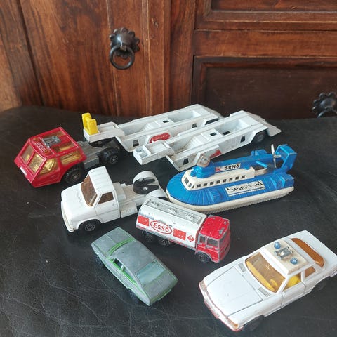 Matchbox legetøjsbiler i farverne rød, gul, grøn og pink.