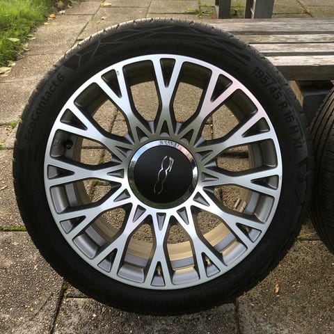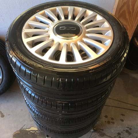 4 styks originale Fiat fælge med helår dæk som er fra 2025 over 7mm på alle dæk. Der er lidt kanstens mærker.