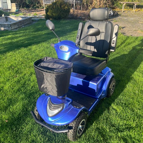 El-Scooter med kurv, justerbart sæde med nakkestøtte og armlæn. Scooter har et display med kontrolpanel og to drejeknapper. Designet til mobilitet og komfort ved indendørs og udendørs brug.