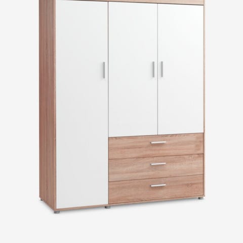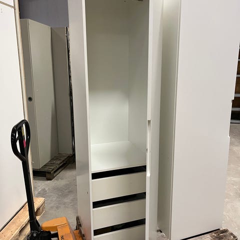 garderobeskab i hvid farve med to døre. Skabet indeholder flere hylder og en stang til ophængning, hvilket giver forskellige opbevaringsmuligheder til tøj og tilbehør.