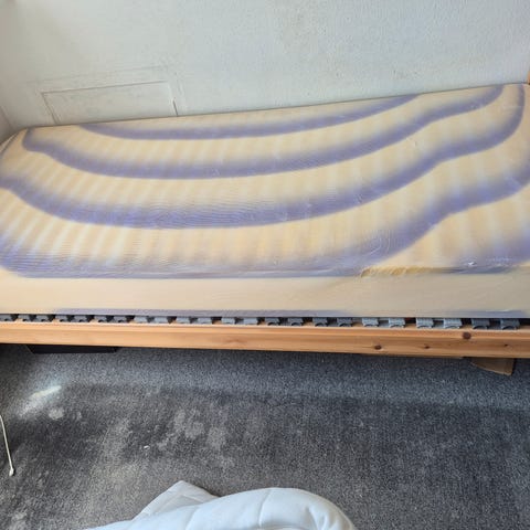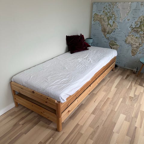 IKEA UTÅKER stabelbar seng med mål 80x200 cm. Sengen er fremstillet i træ og designet til at kunne stables. Madrasser medfølger hvis det ønskes (de er meget tynde). Der er en beskadiget lamel på hver lamelbund.