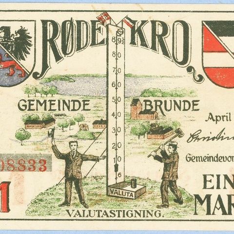 Nødpengeseddel på 1 Mark fra Broager Kommune, 1919. Ufoldet og i fin stand.