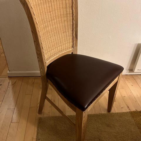 1 stk brugt spisebord og 4 brugte spisebordsstole i egetræ. Spisebordsstole er fra Findahl ( Findahl's møbelfabrik ) bordet ved jeg ikke noget om. Spisebord og stole har alm brugsspor dog er det ene stoleben knækket halvt i ydre del af tapningen, så der skal en ny dyvel i. Bord L:120cm. B:80cm. H:74,5cm. Stole B:44cm. D:38cm. H:87cm. SH:46cm. Spisebord og stole er ikke nye og sælges derfor som brugte, derfor kan der forekomme ridser, slid og skrammer. Prisen er kun 1.500kr samlet, pga den ene stol.