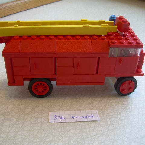 lego 332. Lastbilen er bygget med de gamle klodse. Dørrene er lidt falmet, Det hjul som er på billed 4 forrest er blevet skiftet ud, siden billed er taget med et pænt hjul og dæk. Ellers syntes jeg den er i pæn stand trods alleren