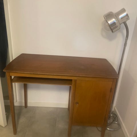 Antikt træskrivebord med flere skuffer og skabe. Bordet er lavet af træ med en mørk finish og har en klassisk stil. Det er velegnet til brug som skrivebord eller arbejdsbord i hjemmet eller kontormiljøer.