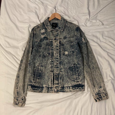 En flot Forever 21 denimjakke med røde, blå og hvide striber ned langs ærmerne i Str. S