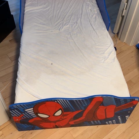 Sengen er dekoret med Spiderman og kan lyse (batteri skal udskiftes).