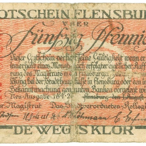 Nødpengeseddel på 25 Pf. fra Flensburg, 1920.