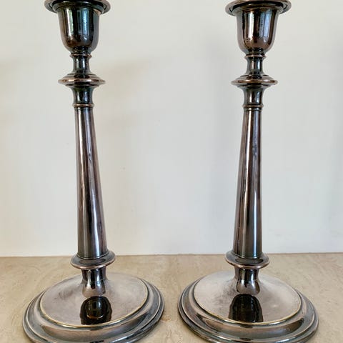 Ældre plet sølv lysestager sukker og flødekande sælges pr. Sæt 100kr.