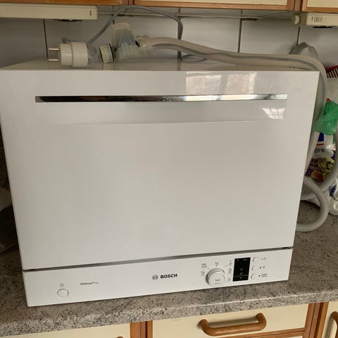 Bosch bordopvaskemaskine i hvid. Kompakt model med indvendig kurv og bestikkurv.
