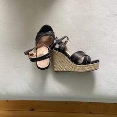 Vidal Iris sandaler i størrelse 38, sort farve. Sandalerne har en kilehæl og åbne tæer med krydsede remme foran og strop omkring hælen. Materialet er sort, og skoene er designet til kvinder.