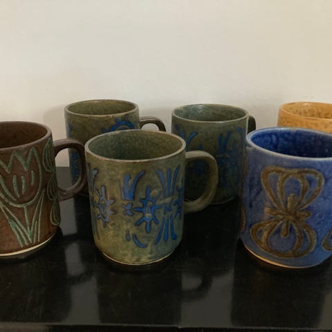 Retro sæt bestående af 7 forskellige (3 Boserup Minde) krus fra 80-90érne med forskellige tryk, herunder kalender for året 1988 og forskellige motiver. Krusene er lavet af porcelæn og har hank. De kan anvendes til varme drikke som kaffe eller te.