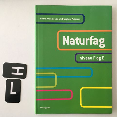 Naturfag Niveau F og E bog med grøn forside og farvede linjer. Anvendes til undervisning i naturfag på niveau F og E.