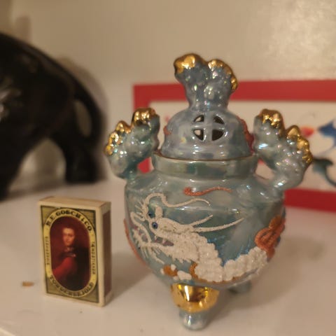 Gammel marokkansk røgelsesbrænder. Solid keramik. Købt i Marrakech. Den er velegnet til dekorative formål eller som samlerobjekt, men har ikke testet dens funktion som røgelsesbrænder.