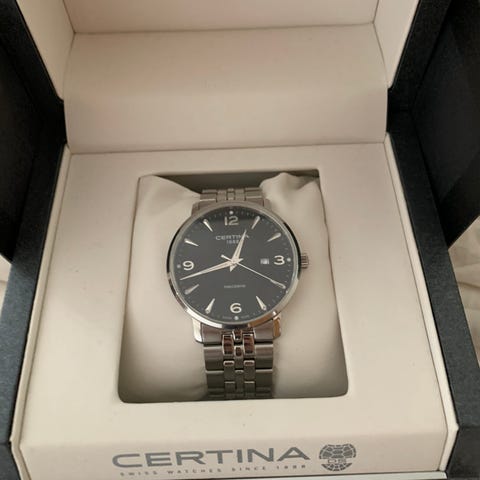 Certina 1888 herreur med urskive i sølvfarve og rustfrit stålarmbånd. Uret har tydelige sorte arabertal og datovisning ved kl. 6.