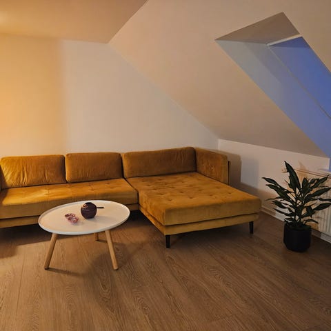 Sælger denne behagelige velour sofa med en god lang og bred chaiselong.