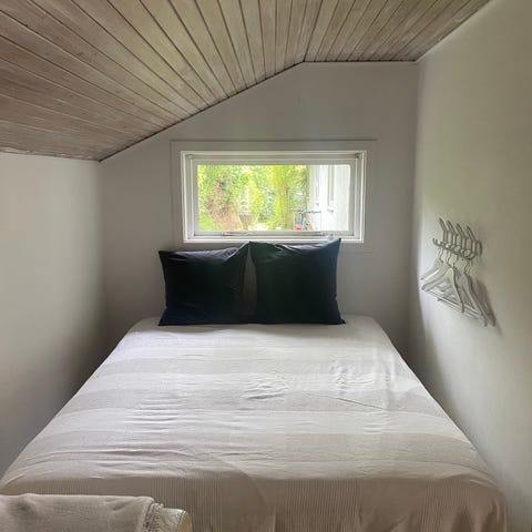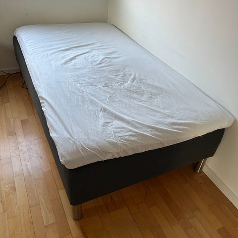 Flot og velholdt boxmadras på 135 x 200 cm incl topmadras, sengetæppe og pyntepuder.