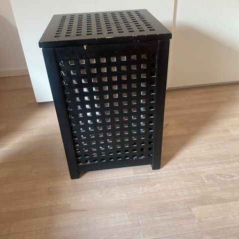 Trip trip vasketøjskurv fremstillet i træ med gittermønster. Kurven har et aftageligt låg og en indvendig stofpose.