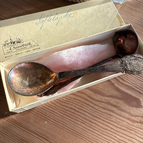 Fint sæt i svensk nysølv bestående af flere skeer og en større serveringsske. Bestikket har dekorative detaljer på håndtagene og leveres i et etui med rød satinforing. Materialet er svensk nysølv egnet til servering og spisning.