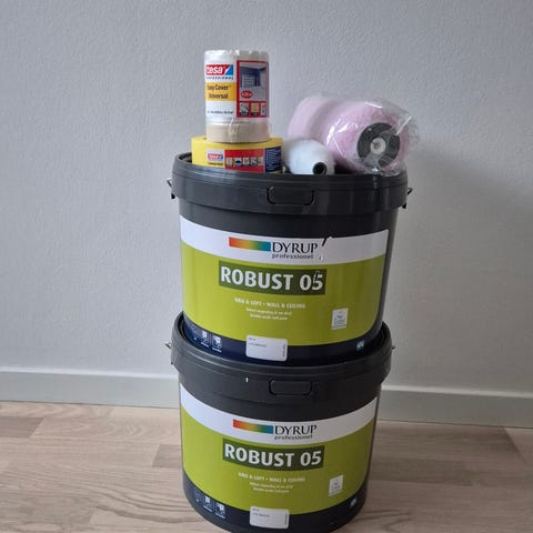 2 spande Dyrup Robust 5, 20 Liter, farve lys råhvid, den er egnet til loft og vægge.