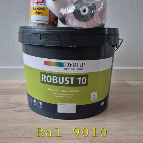 Dyrup Robust 10, 10 Liter, farve Ral 9010 (brækket hvid), den er egnet til entré, toilet og køkken vægge, da glans 10 er vaskbar.