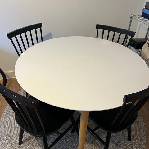 Fint rundt spisebord med mulighed for forlængelse med tillægsplade (50cm). Bordet har nogle rigtig smukke ben med udskæringer. Enkelte små malingafskalninger