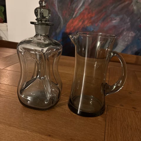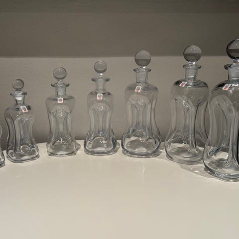Klukflaske med klar prop og 8 glas fra Holmegaard efter design af Michael Bang