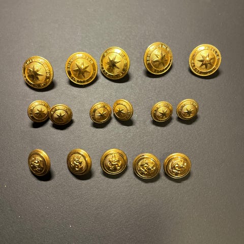 Fine vintageknapper med maritime symboler i designet med et kronet anker, der symboliserer flåden.