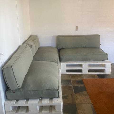 11 × EUR paller med hynder. Tåler udendørs brug.