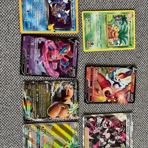 Pokémon samlekort i forskellige varianter og motiver. Kortene er opbevaret i plastlommer i en mappe og inkluderer forskellige energityper og karakterer fra Pokémon-universet. Egnet til samling eller spil. Skal afhentes.