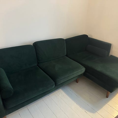 Sofaen kan skilles i 2 dele og skal bæres ud fra en stue lejlighed.